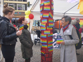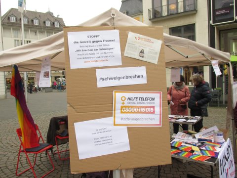 Am Internationalen Tag gegen Gewalt an Frauen, fand eine Aktion von Frauen in bunt in Kooperation mit den Frauen vom Frauen*streik Bonn auf dem Markt in Bonn statt. Gemeinsam machten wir auf das Hilfetelefon aufmerksam und auf die Aktion "Gib andern Frauen die Hand" Erkennungszeichen ist ein lila Bändchen am Handgelenk. Das Hilfetelefon "Gewalt gegen Frauen" ist ein bundesweites Beratungsangebot für Frauen, die Gewalt erlebt haben oder noch erleben. Es bietet Beratung in 17 Sprachen in Gebärdesprache und Online Beratung an.